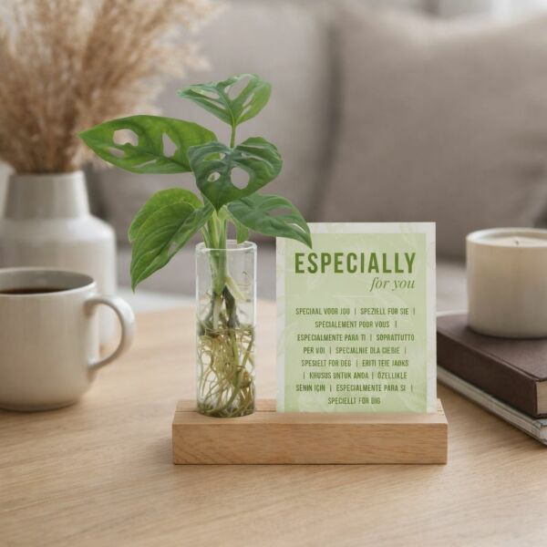 Deze stijlvolle hydroponieplant wordt gepresenteerd in een glazen buisje op een houten standaard met een sleuf voor een los A7-kaartje. Zowel het houten blokje als het kaartje zijn volledig te personaliseren met een logo, slogan of persoonlijke boodschap. Bij dit artikel is het A7-kaartje zoals op de foto standaard inbegrepen. Wil je in plaats daarvan een eigen gepersonaliseerd kaartje in full color toevoegen? Kies dan de personalisatie-optie, je betaalt alleen de opstartkosten voor het bedrukken.